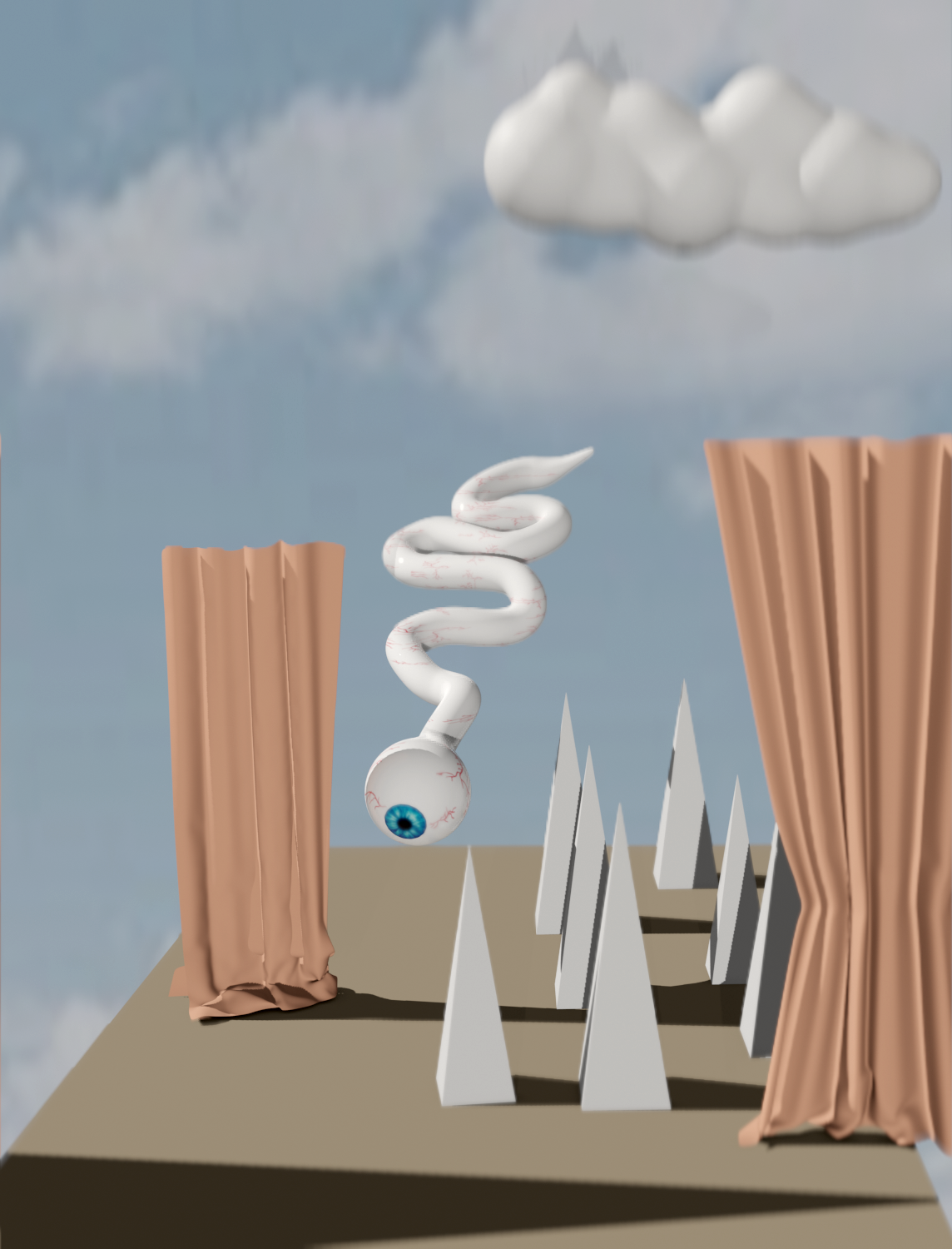 Extra short film (1min) inspired by the work of Magritte and Platon’s Allegory of the Cave. The eye of his Magritte’s painting Poetic World II (1937) falls from the clouds, passing through different paintings or scenes from the belgium painter’s universe - landing in the painting La Condition Humaine representing a cave - falling eye-to-eye with its doppleganger - a rope around its neck.
